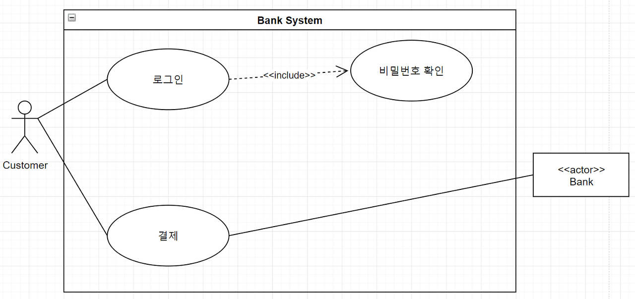 이런 경우 비밀번호 확인이 로그인에 포함되었다고 볼 수 있고, 로그인 유스케이스에서 비밀번호 확인 유스케이스 방향으로 화살표를 그린 후 중앙에 <<include>>를 표시하여 포함 관계를 나타냅니다.